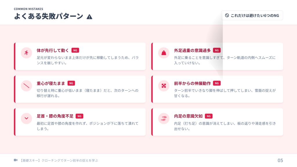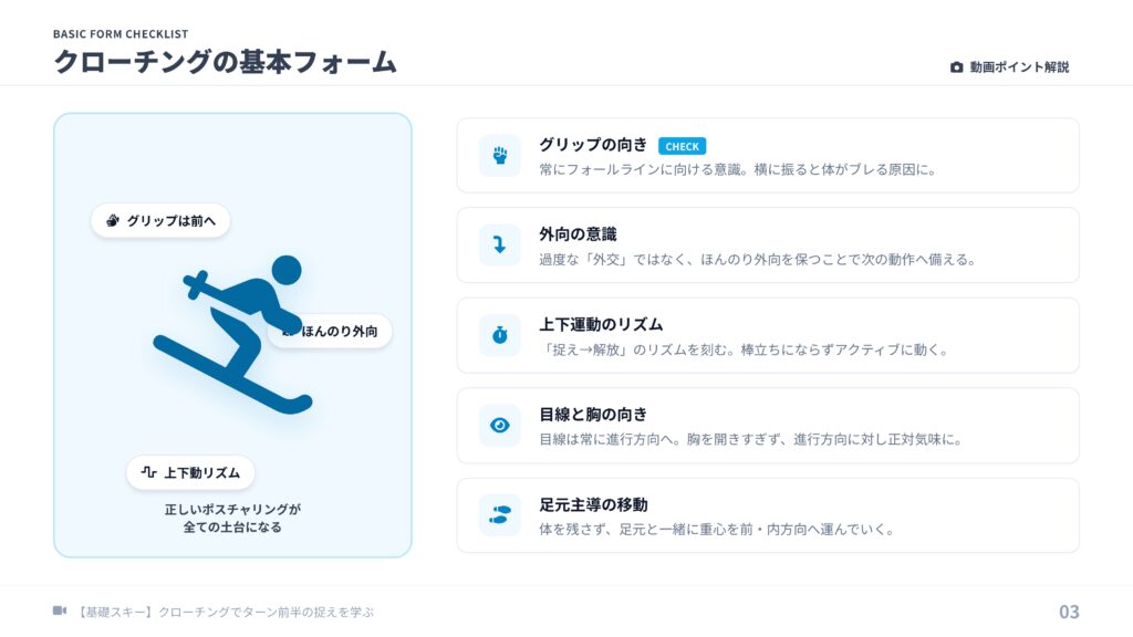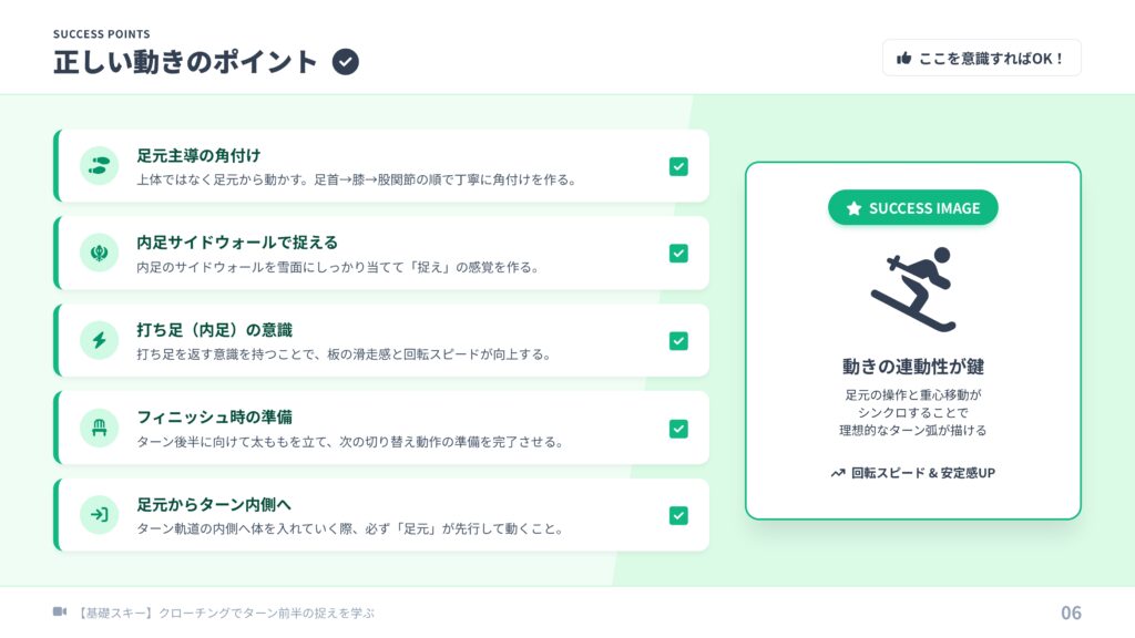 【基礎スキー】クローチングのターン前半が決まる!「足元主導」の捉えと修正法