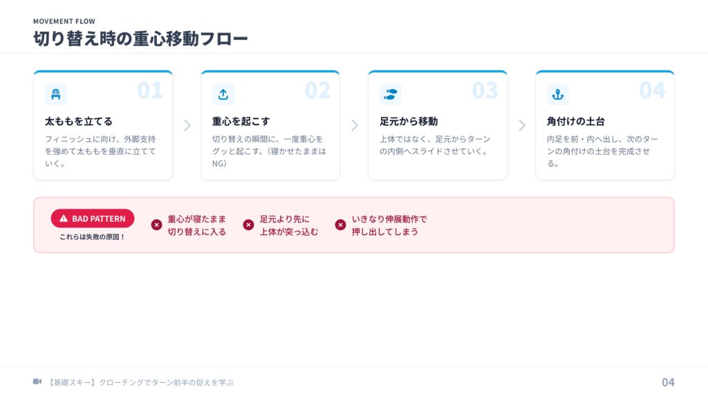正しい動きは、切り替えの瞬間に一度しっかり重心を起こすことです。