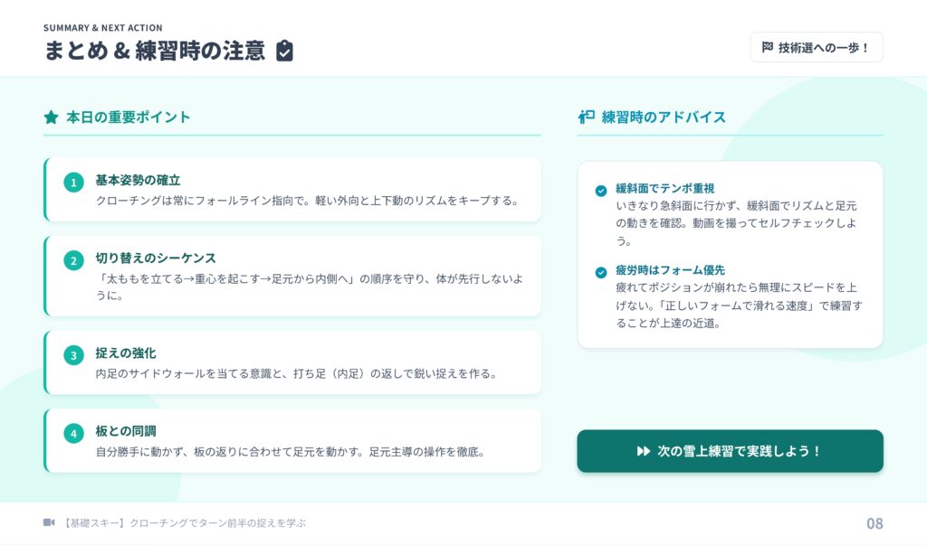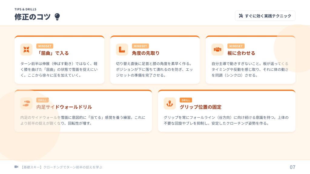 - 感覚: 内足のサイドウォールを当てにいく意識で、鋭いグリップを作る。