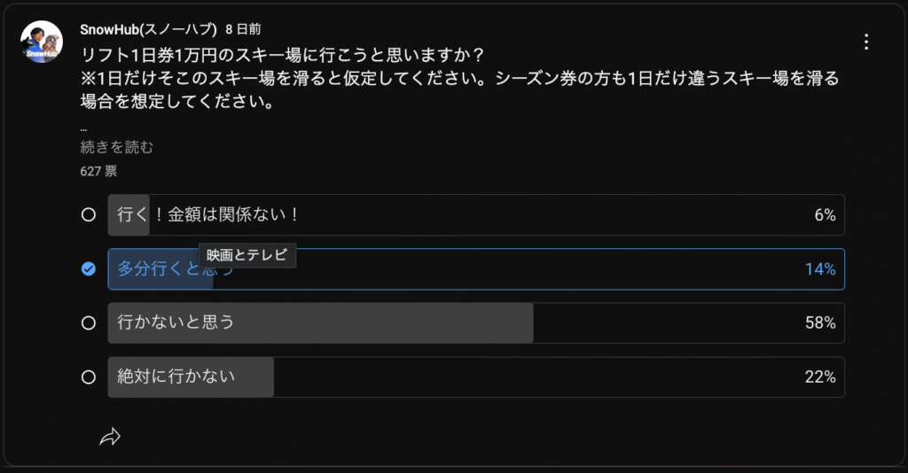 YouTubeでのアンケートでは、「1日1万円のリフト券のスキー場に行きますか?」という質問に対して、総投票数627票の結果は以下の通りでした。